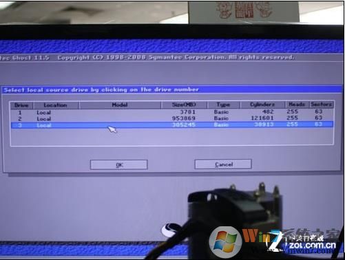 2、我們需要選擇源數(shù)據(jù)硬盤,即原配320GB硬盤(Drive3,Size容量305245MB),并點擊“OK”確認(rèn),Windows7原配320GB硬盤的字體變成灰色,表示成功作為源數(shù)據(jù)硬盤。