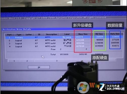 4、隨后我們可看到目標(biāo)數(shù)據(jù)硬盤的分區(qū)容量校準(zhǔn)界面,主要是為新升級硬盤的分區(qū)存儲空間大小。Ghost工具會自動分成和原配硬盤一樣多的分區(qū),同時還會自動分配存儲空間。當(dāng)然用戶也可以調(diào)整存儲空間,實際黃色和藍(lán)色方框內(nèi)存的數(shù)字不可調(diào)節(jié),只有紅色方框內(nèi)的白色字體,可以調(diào)整大小。