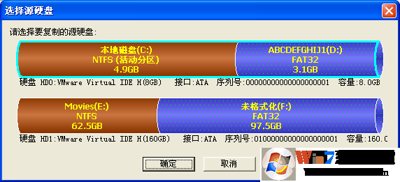 該對話框打開后,程序會自動彈出源硬盤及目標(biāo)硬盤選擇對話框。如下圖所示:
