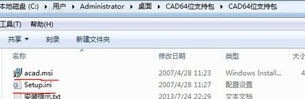 2、下載CAD64位支持包。解壓后里面含 acad.msi 和Setup.ini 兩個(gè)文件,如圖所示: