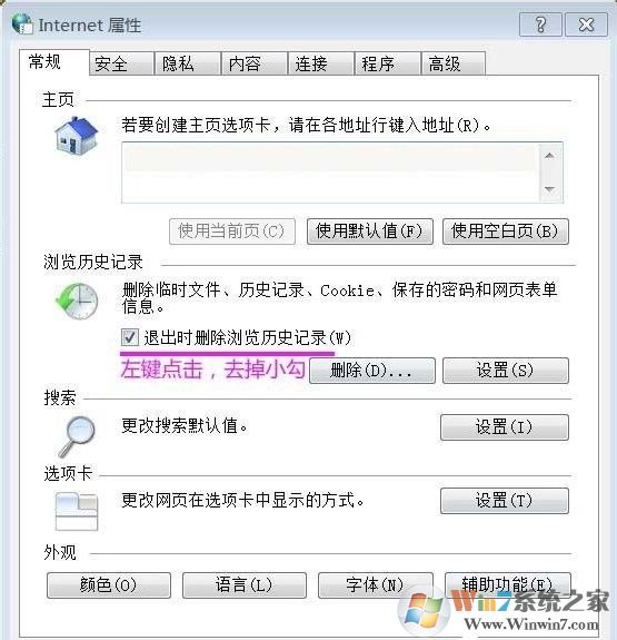 2、我們在彈出的Internet屬性窗口找到瀏覽歷史記錄,左鍵點擊退出時刪除瀏覽器歷史記錄,去掉前面小框內(nèi)的小勾,再點擊確定。