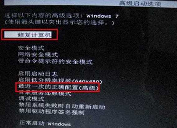 1、重新開機(jī),一直連續(xù)按下“F8”鍵,在“高級啟動選項”中,選擇“修復(fù)計算機(jī)——最后一次正確配置”。