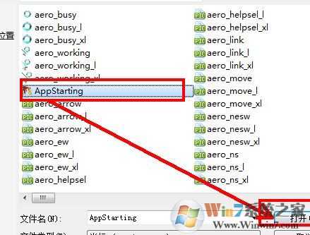 8、選擇我們剛才復(fù)制好的鼠標文件,選中后再點擊“打開”按鈕,點擊應(yīng)用在點擊確定即可!