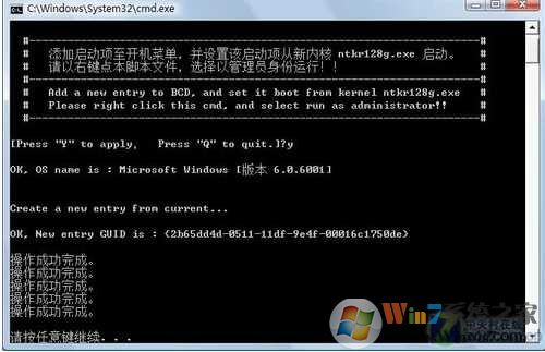 然后運行壓縮包里面的AddBootMenu程序,當(dāng)彈出對話框時,輸入Y回車即可,此時系統(tǒng)提示破解操作成功完成。