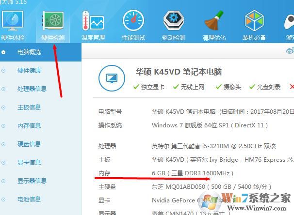 1、我們可以使用第三方軟件,在這里小編以 魯大師為例,我們打開魯大師之后點擊檢測內存可以更加清楚知道型號內存大小,如下圖所示:
