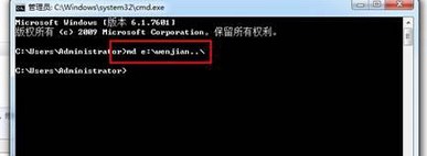 2、在打開的命令提示符窗口中,輸入創(chuàng)建命令“md e:wenjian.。”創(chuàng)建新的文件夾,記住文件后面要加兩個點,然后回,車E盤下就會出現(xiàn)你創(chuàng)建的文件夾;