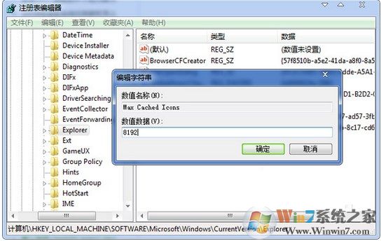 3、雙擊打開Max Cached Icons鍵值,進(jìn)入字符串值編輯窗口,然后將數(shù)據(jù)修改為8192,再點(diǎn)擊確定按鈕即可完成設(shè)置。