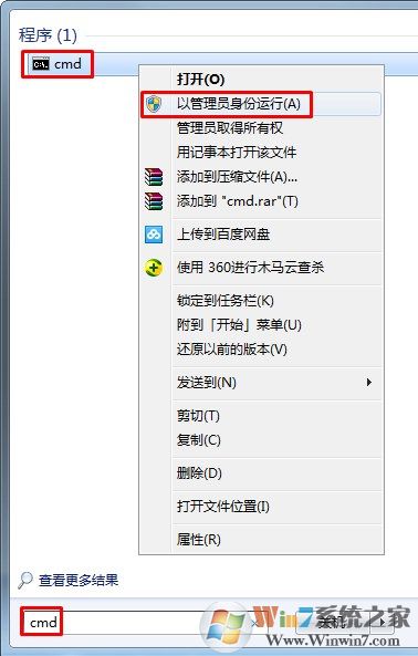 1、開始菜單搜索CMD這個程序,在這程序上面右鍵---以管理員方式運行。