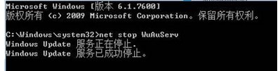 2、在運行后的cmd程序中輸入:net stop WuAuServ,然后回車關(guān)閉服務(wù)。