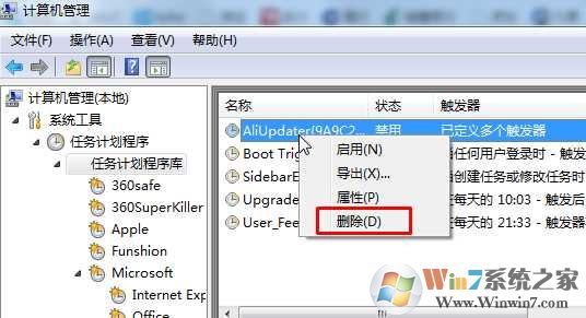 2、然后在任務(wù)計(jì)劃程序中找到定時(shí)關(guān)機(jī)的任務(wù)計(jì)劃程序,刪除即可;