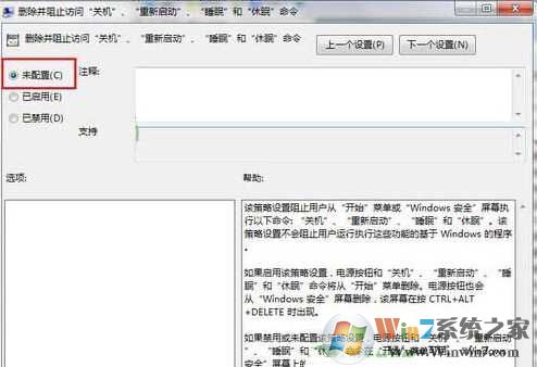 3、在“刪除和阻止訪問‘關(guān)機(jī)’命令屬性”窗口中,點擊“設(shè)置”選項卡,選擇“未配置”,然后點擊“確定”按鈕。