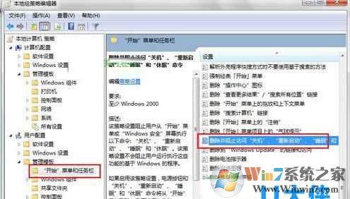2、“開始”→“運(yùn)行”,在“運(yùn)行”對話框中輸入“gpedit.msc”,然后點擊“確定”按鈕。在“本地組策略編輯器”窗口中,點擊用“戶配置”下的“管理模板”→“「開始」菜單和任務(wù)欄”,然后雙擊右側(cè)的“刪除和阻止訪問‘關(guān)機(jī)’命令”。