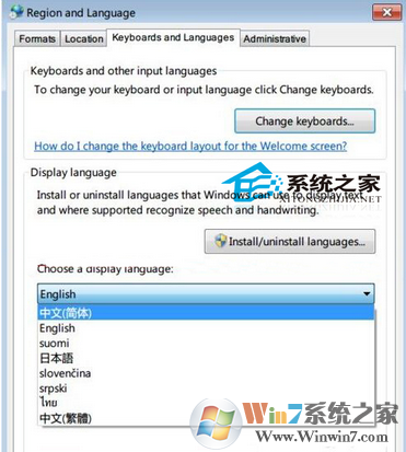 3、接下來(lái)在“Region and Language”設(shè)置窗口中,點(diǎn)擊“Install/unistall languages”安裝語(yǔ)言,當(dāng)然如果你已經(jīng)安裝了“簡(jiǎn)體中文”那么就可以在“Choose a display language(選擇一個(gè)顯示的語(yǔ)言)”中找到它,如果沒(méi)有那么先點(diǎn)擊Install languages 來(lái)安裝簡(jiǎn)體中文語(yǔ)言,系統(tǒng)會(huì)從Windows updata中獲取語(yǔ)言更新(或者可以下載Win7簡(jiǎn)體中文語(yǔ)言包進(jìn)行安裝),(這里小編已經(jīng)安裝了所以已經(jīng)有了中文)最后選擇“中文(簡(jiǎn)體)“并點(diǎn)擊OK;