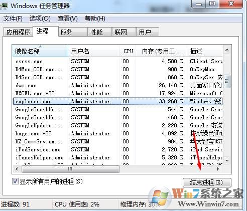 1、右鍵點(diǎn)擊任務(wù)欄打開任務(wù)管理器,然后在進(jìn)程中找到explorer.exe,點(diǎn)擊結(jié)束任務(wù);