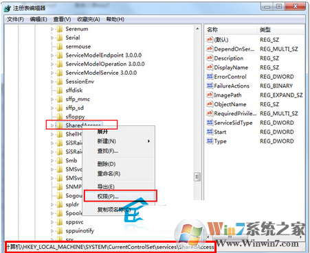 1. 在開始菜單中打開“運(yùn)行”輸入"regedit"即可打開注冊(cè)表,并在注冊(cè)表中依次定位到以下子項(xiàng)HKEY_LOCAL_MACHINE\SYSTEM\CurrentControlSet\Services\SharedAccess;接著右鍵SharedAccess,選擇“權(quán)限”。