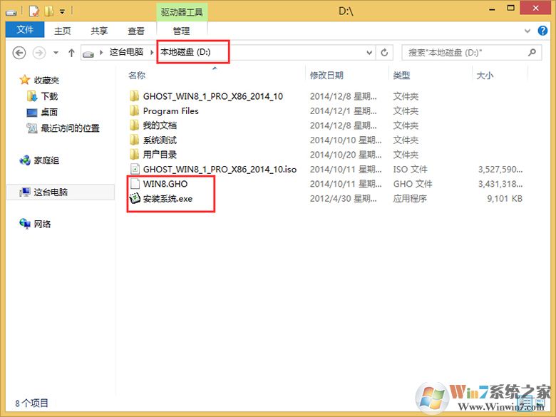 4、把“WIN8.GHO”和“安裝系統(tǒng).exe”兩個(gè)文件剪切到磁盤根目錄下,這里選擇放在D盤里;