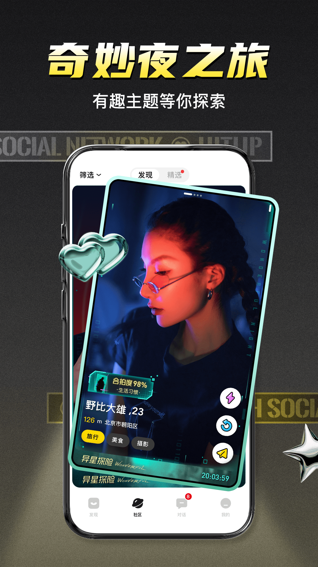 首創(chuàng)目的語(yǔ)言系統(tǒng),用一個(gè)共同目的代替無(wú)聊的開場(chǎng)白,為你推送有趣、會(huì)聊、個(gè)性、獨(dú)特的朋友,快速找到和你此時(shí)此刻交友目的一致的伙伴。再也不怕找不到對(duì)的人,再也不怕浪費(fèi)時(shí)間,再也不怕因直接而尷尬,率性而為!
