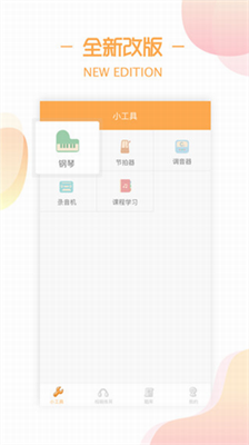 4、點(diǎn)到小工具,小工具中有鋼琴,可以模擬鋼琴?gòu)椬嗟模缓笥泄?jié)拍器、調(diào)音器、錄音機(jī)、課程學(xué)習(xí)。每一個(gè)不同的工具針對(duì)不同的用途;