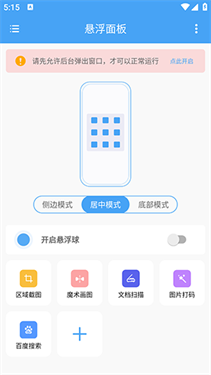 《懸浮面板》是一款功能豐富的手機(jī)桌面懸浮菜單軟件,這款軟件為用戶提供了豐富多樣的工具,用戶在這可以將自己常用的應(yīng)用程序添加到懸浮窗中,方便隨時(shí)調(diào)取。同時(shí)這款軟件還支持側(cè)邊、居中、底部三種模式,用戶可以根據(jù)自己的使用習(xí)慣進(jìn)行選擇,軟件中還有區(qū)域截圖、文檔掃描、圖片打碼等大量的常用工具。有需要的用戶們趕緊來下載試試看吧!
