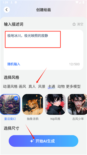 5、在 AI 繪畫頁面,輸入描述詞并選定風格,快速生成畫作。