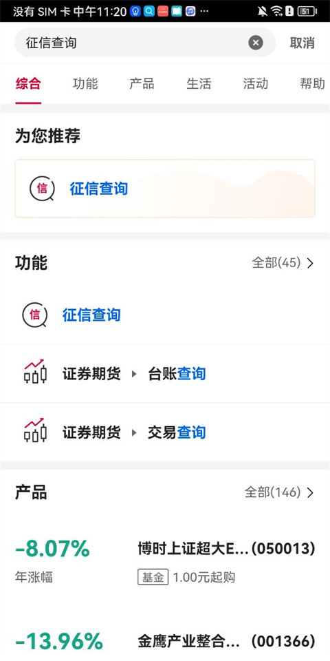 1、打開軟件,在首頁上方搜索框內(nèi)輸入征信字樣, 然后點(diǎn)擊“征信查詢”
