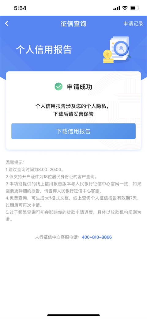 4、最后待申請成功,下載征信報(bào)告即可(注:一般兩個小時以后就會出結(jié)果,七天有效,過期后可再次申請)