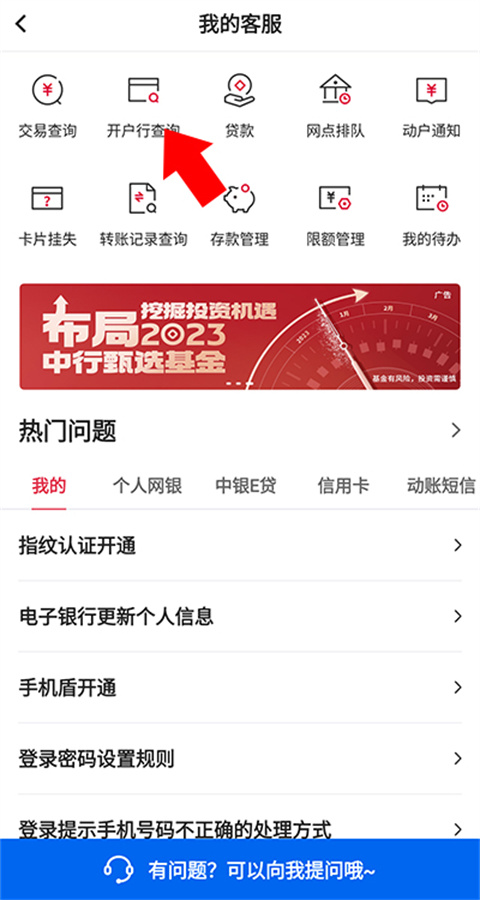 3、進(jìn)入客服界面后,點(diǎn)擊開戶行查詢并輸入對應(yīng)的卡號即可