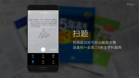 MIUI8掃題解題App是小米MIUI8系統(tǒng)中掃一掃新添加的功能,現(xiàn)在手機上各種拍照搜題軟件都很火,來自MIUI8官方的拍照搜題功能來了,涵蓋了全國各地所有初一至高三6各年級全學(xué)科的題庫,手機掃一掃,輕松秒出答案。