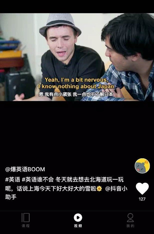 在產(chǎn)品主菜單欄,設(shè)有專門的視頻入口,視頻入口內(nèi)短視頻以與抖音相同的信息流模式呈現(xiàn),內(nèi)容均為英語口語學(xué)習(xí)相關(guān)內(nèi)容。