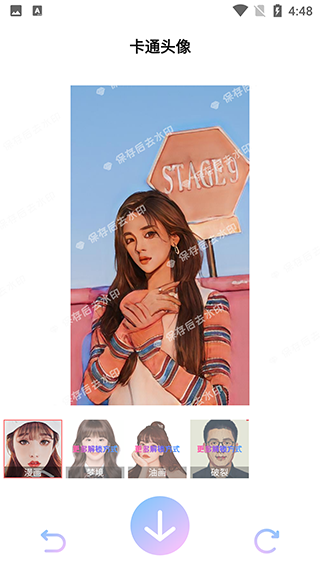 3、圖片自動修改成了漫畫風格,點擊屏幕底部保存去除水?。ㄗ⒁?,如果提示要訂購會員,關(guān)閉即可,然后點擊觀看視頻就可以保存圖片了)。