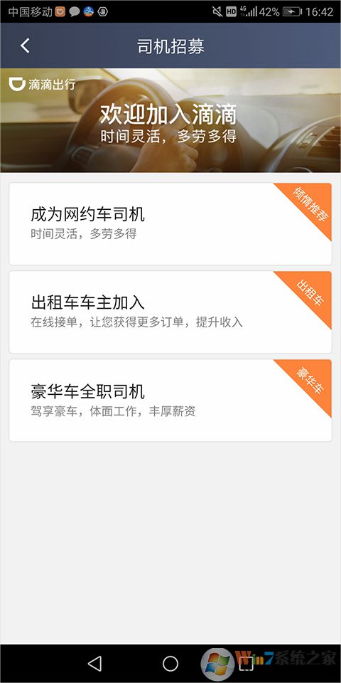 2、在打開的新頁面中,選擇一種司機(jī)類型,平臺(tái)目前提供了三種司機(jī)類型,有網(wǎng)約車司機(jī)、出租車車主、豪華車全職司機(jī)。這里以第一種網(wǎng)約車司機(jī)為例
