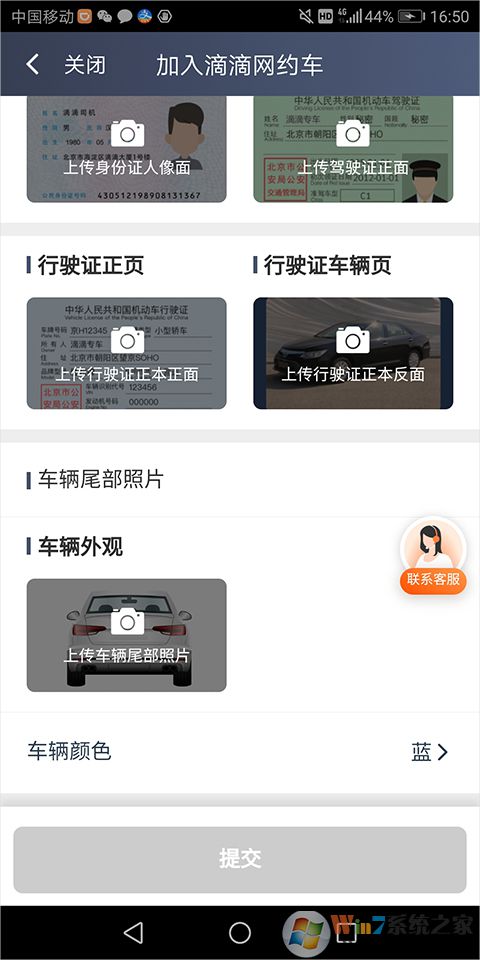 5、依次上傳身份證人像面、駕駛證正面、行駛證正本正面和反面,以及車輛尾部照片,選擇車輛顏色,之后點(diǎn)擊提交等待平臺(tái)審核通過即可注冊(cè)成功