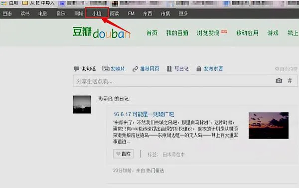 1、確保自己的豆瓣賬戶是登錄的,在主頁面中,找到小組選項,點擊進入小組的頁面: