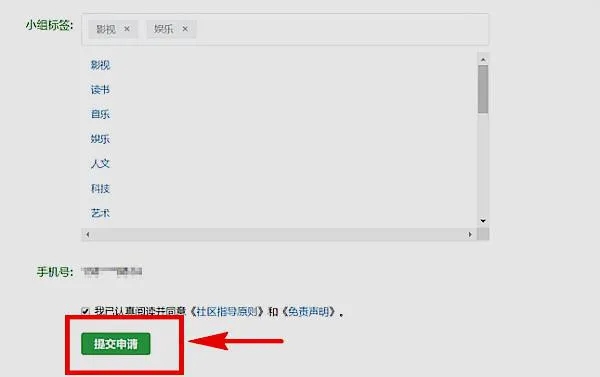 5、往下拉頁面,資料填寫完回整后,把用戶協(xié)議的勾打上,最后點擊提交申請,耐心等待豆瓣官方驗答證通過就可以了。以上就是申請豆瓣小組的流程: