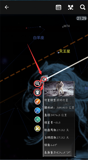 5、而這時候,你可以看到說明框左上角的那個箭頭圖標,和之前主菜單里3D探索模式的圖標是一樣的。點擊這個圖標,就會把探索對象切換到月球