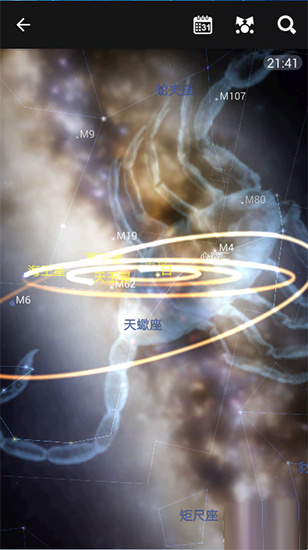 3、我進入系統(tǒng)的坐標為地球,用手指旋轉(zhuǎn)界面,找到明亮的光帶,那就是銀河。下面三圖為銀河中的天鵝座、獵戶座和天蝎座。