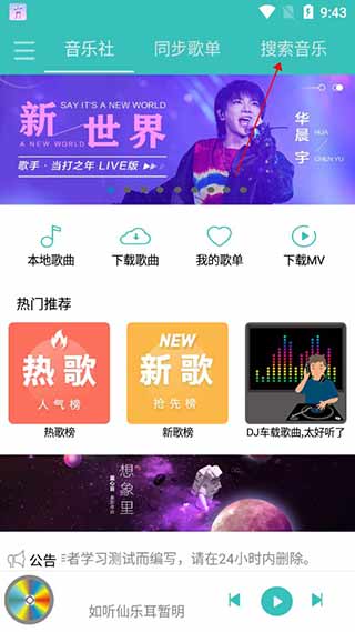 1、如果軟件主頁找不到自己喜歡的音樂,還可以點擊右上角搜索音樂;