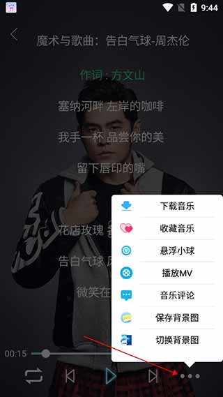 5、可以看到有喜歡的周董海報和歌曲歌詞,這時候點擊右下角三點,還有保存背景圖和下載歌曲等強力功能;