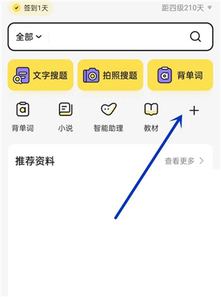 打開不掛科軟件,頁面進(jìn)入學(xué)習(xí)界面。點(diǎn)擊右上角背單詞下面的加號(hào)圖標(biāo),如圖。