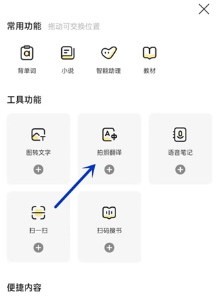 在工具界面點(diǎn)擊進(jìn)入拍照翻譯即可進(jìn)行拍照翻譯。