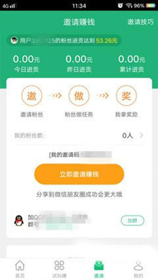 點擊“邀請賺錢,”進入頁面后再點擊“立即邀請賺錢,”邀請到的粉絲完成任務(wù)后你就可以得到相應(yīng)的獎勵,或者可以將自己的邀請碼分享到朋友圈。