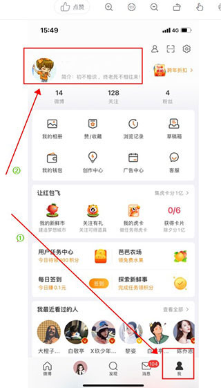 1、下載微博app,登錄微博后,點(diǎn)擊右下角的“我的”,然后點(diǎn)擊上方的頭像邊上的文字簡(jiǎn)介,如下圖所示。