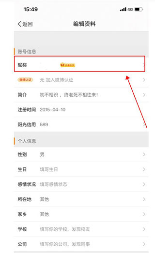 3、進(jìn)入基本信息窗口,點(diǎn)擊昵稱欄目。