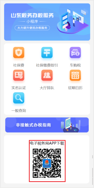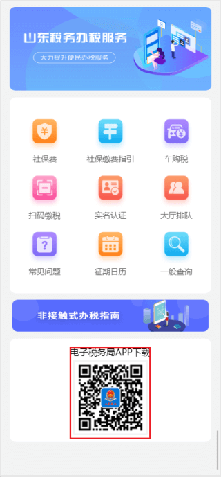 方式2:通過“山東稅務(wù)”微信公眾號底部“辦稅服務(wù)”欄目里面的“電子稅務(wù)局APP下載”二維碼下載安裝。