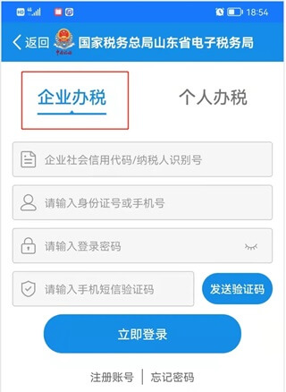 打開山東省電子稅務(wù)局APP,打開【企業(yè)辦稅】登錄頁面,點(diǎn)擊注冊賬號,根據(jù)提示輸入相關(guān)驗證信息完成注冊。