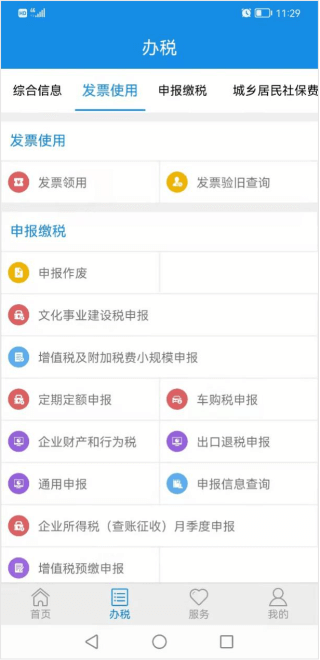 打開電子稅務(wù)局APP,登錄企業(yè)賬戶,點(diǎn)擊辦稅,進(jìn)入辦稅頁面,功能有代開發(fā)票、發(fā)票網(wǎng)上申領(lǐng)、小規(guī)模及附加稅費(fèi)申報、車購稅申報等功能。