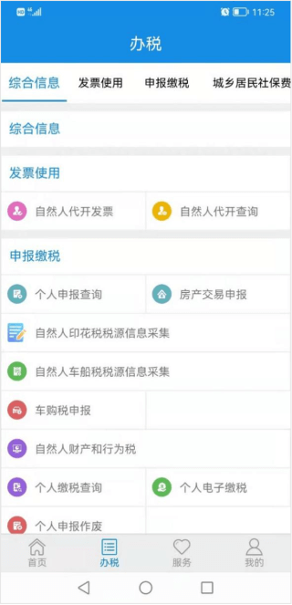 打開山東省電子稅務(wù)局APP,登錄個人賬戶,點(diǎn)擊辦稅,進(jìn)入辦稅頁面,主要功能有代開增值稅普通發(fā)票、車購稅申報、城鄉(xiāng)居民社保費(fèi)繳納、靈活就業(yè)社保費(fèi)繳納等功能。