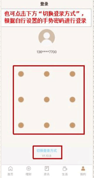 2、也可點(diǎn)擊下方 切換登錄方式 根據(jù)自行設(shè)置的手勢密碼進(jìn)行登錄;