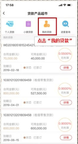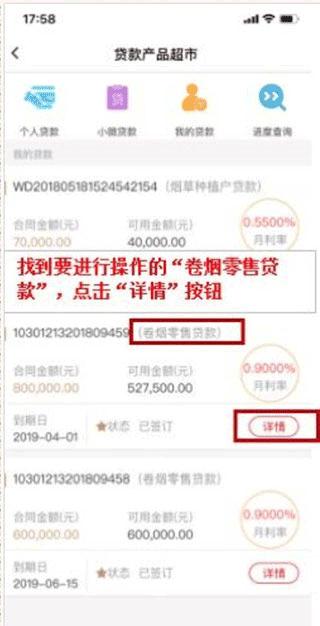 5、找到卷煙零售貸款,點(diǎn)擊詳情按鈕;