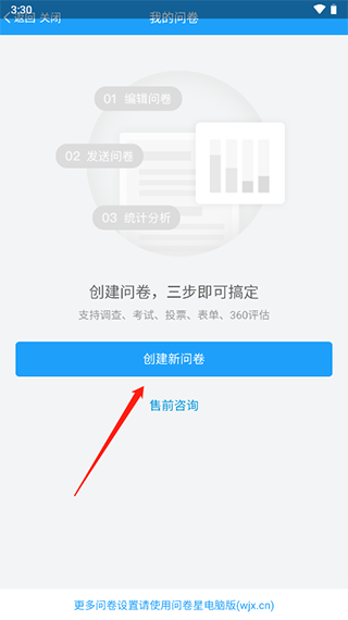 1、首先打開(kāi)問(wèn)卷星app,直接點(diǎn)擊創(chuàng)建新問(wèn)卷